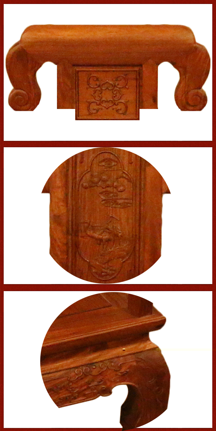 之后,是餐椅的主架骨,坐板以及四腳處,餐椅坐板平整圓潤,四處椅腳處亦呈圓滑之態向下順勢延伸,頗顯自然流和,餐椅正左右三面各有三條支板木架相接,使之更加穩固,椅腳各處亦有多處祥云絲邊鑲嵌裝飾之上,整體裝飾上也愈更顯得和諧工整美觀。