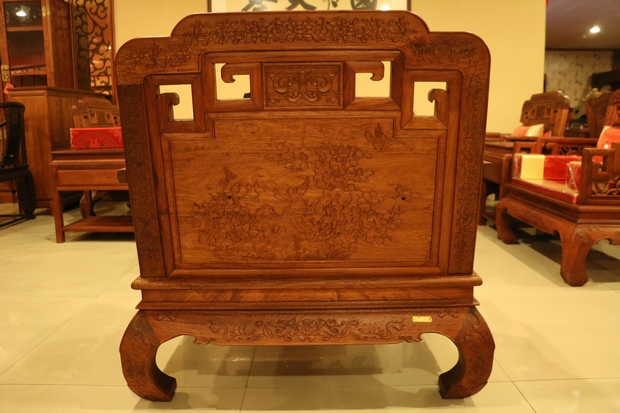 至上而下,一木呈“凸”字形式樣形狀的木板橫架于沙發靠背最上部的左右兩端,“凸”字上邊中間“幾”字形部分則設計的較為圓潤扁長,長度約占背板的五分之三。在木板的正背面兩處則均雕繪有一環串聯著的牡丹花紋飾,顯得極為秀雅端莊,古典奢華,花意柔存。
