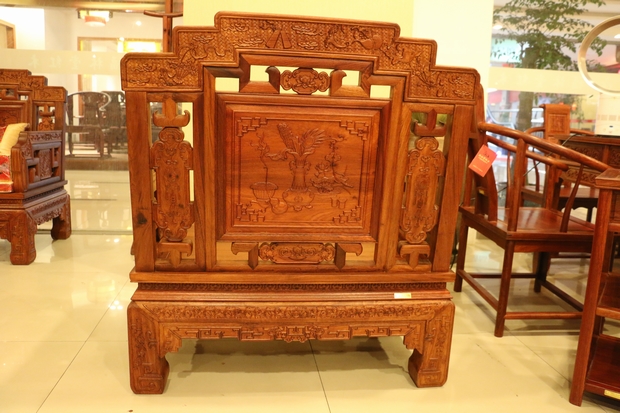 沙發(fā)正上方為一條橫架著的左右兩邊呈三截"樓梯"式樣的長(zhǎng)板,長(zhǎng)板的正面和背面都刻畫(huà)了許多喻示著吉祥平安福到之意的法器寶物,譬如道家八寶中的:鐵拐李的寶葫蘆、曹?chē)?guó)舅的玉板、何仙姑的荷花以及藍(lán)采和的花籃等。