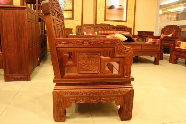 而今天,筆者要給大家介紹的這一款紅木家具沙發(fā)——福臨門(mén)沙發(fā),正是一款為了表達(dá)人們這一初衷和愿望,用以其承載美好的向往和精神寄托的上等紅木沙發(fā)。該款沙發(fā)同樣采用的是福林堂紅木所擅長(zhǎng)的優(yōu)質(zhì)緬花而制作,整體做工表現(xiàn)精良精湛,雕刻圖案豐富多樣,筆鋒縱橫飽滿有力,在沙發(fā)的正面,高幾、角幾各處以及小平幾的上方還刻畫(huà)了許多以昭示"福到"之意的優(yōu)美圖畫(huà)圖案,古人們神話故事傳說(shuō)中的宏偉事跡等,用手輕撫摸之,給人以身臨其境之感,畫(huà)面代入感極其強(qiáng)烈,可以感受到,那畫(huà)筆縱橫交錯(cuò)的洶涌的海水,蜿蜒有秩形態(tài)各異的各種古器法寶圖案,還有那原木所自帶散發(fā)出來(lái)的淡淡的清香,古樸而讓人難以釋?xiě)淹鼌s。
