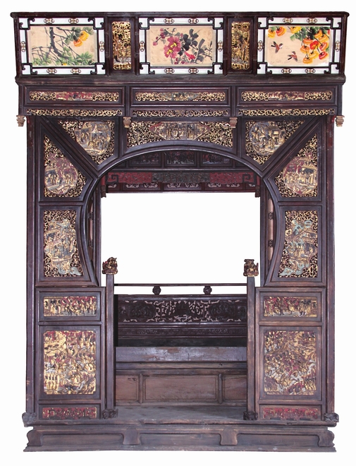 床為月洞式開門,由11塊獨立雕花板拼成。上部7塊雕花板中心開光雕刻拜謁、訪友、慶